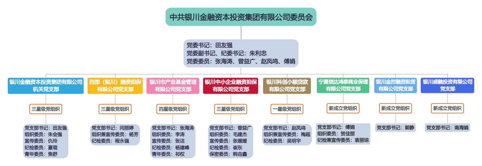銀川金融資本投資集團有限公司黨委于2019年12月6日成立,在銀川市委、市政府及市國資金融黨工委的領(lǐng)導下,堅持以習近平新時代中國特色社會主義思想為指導,堅持正確的政治方向,宣傳貫徹落實黨的路線方針政策,嚴格按照上級有關(guān)部署開展各項工作,有效發(fā)揮黨建在企業(yè)經(jīng)營管理中管大局、把方向的政治引領(lǐng)作用。集團黨委目前設立7個黨支部:中共銀川金融資本投資集團有限公司支部委員會、中共西部(銀川)融資擔保有限公司支部委員會、中共銀川市產(chǎn)業(yè)基金管理有限公司支部委員會、中共銀川中小微企業(yè)科技小額貸款有限公司支部委員會、中共銀川中小企業(yè)融資擔保有限公司黨支部,中共銀川金控融資租賃有限公司黨支部,中共寧夏信達鴻泰商業(yè)保理公司黨支部?,F(xiàn)有黨員104人,其中正式黨員101人、預備黨員3人、發(fā)展對象8人、積極分子32人。